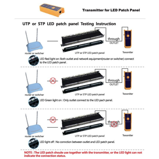 S patch panelom získate vysielač, ktorý pripojíte do zásuvky napr. v kancelárii a v serverovni ľahko identifikujete polohu trasy na patch paneli na tomto patch paneli. Na patch paneli sa rozsvieti zelená LED.Ďalšou možnosťou je identifikovať voľné trasy (nie je pripojené žiadne zariadenie). V serverovni pripojíte vysielač signálu k patch panelu a ak je na konci trasy aktívny prvok, na patch paneli sa rozsvieti červená LED.