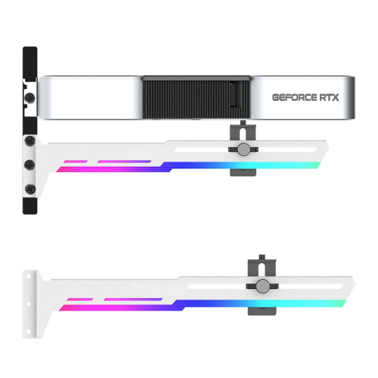 Štýlová verzia tejto opory vašej grafickej karty je vyrobená z oceľového práškovo lakovaného plechu a plastu, zabraňuje prehýbaniu väčších kariet v slotu a dodáva tak zostave lepšiu celkovú stabilitu. Súčasťou je silikónová posuvná opora, ktorú je možné posunúť horizontálne aj vertikálne a umožňuje inštaláciu v rôznych miestach karty, pre maximálnu kompatibilitu s väčšinou kariet. Rozmery držiaka sú 280 x 52mm.
