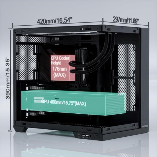 Navzdory kompaktným rozmerom ponúka priestor až pre 400mm dlhé grafické karty, 176mm vysoké chladiče a vodné chladenie až do veľkosti 360 mm. Vo vnútri nájdeš bohaté možnosti osadenia ventilátorov (až 9 kusov 120/140 mm), vyberať môžeš z niekoľkých variantov 1stCOOL ventilátorov vrátane aRGB riešenia, prípadne doplniť aj aRGB držiak grafickej karty.