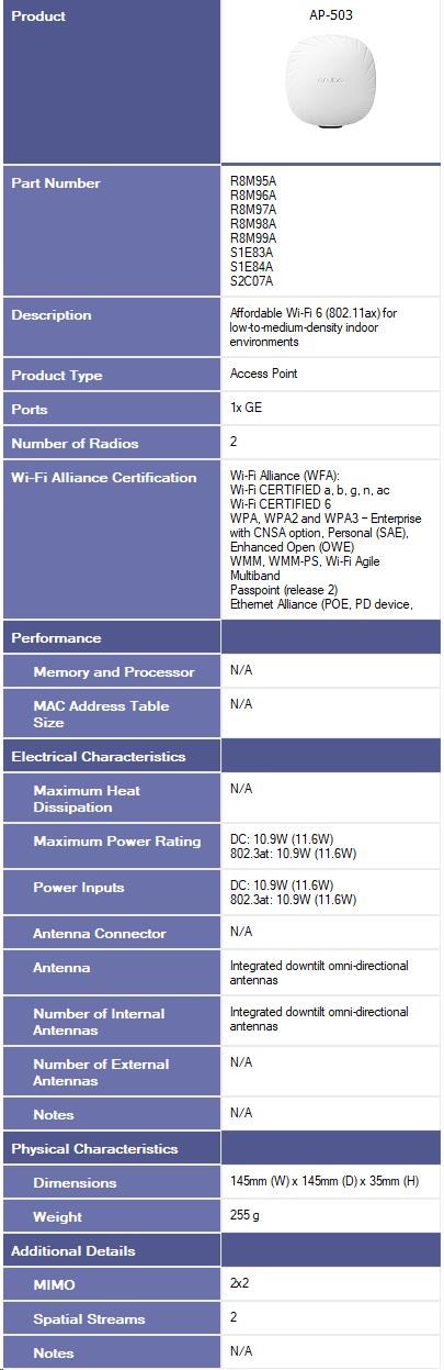5 x HPE Aruba Networking AP-503-RW Dual Radio 2x2:2 802.11ax Wi-Fi 6 Campus Access Point ( 5x R8M98A )