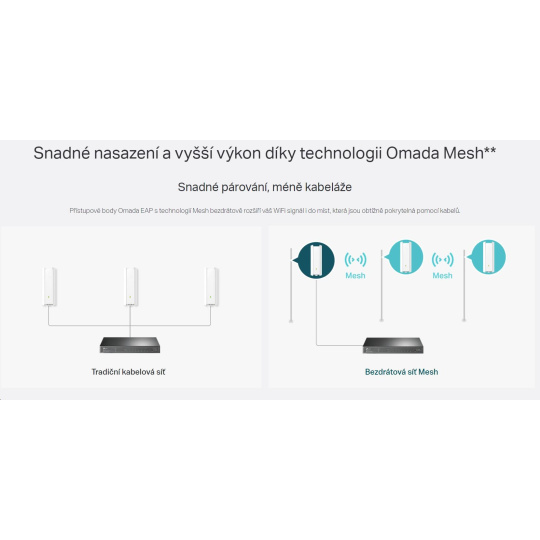 - Technológia Omada Mesh: Umožňuje bezdrôtové spojenie medzi prístupovými bodmi na získanie rozšíreného dosahu a flexibilného nasadenia.