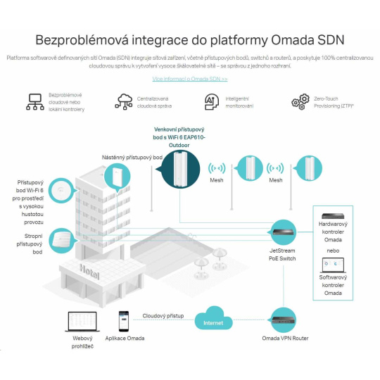 - Centralizovaná cloudová správa: Integrácia s platformou Omada SDN umožňuje cloudový prístup a vzdialenú správu.