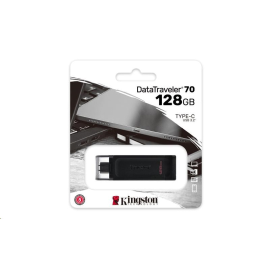 Kingston DataTraveler 70 je prenosný a ľahký flash disk s rozhraním USB-C, ktorý ponúka rýchlosť USB 3.2 1. generácie. Je určený na používanie s kompatibilnými zariadeniami USB-C, ako sú notebooky, tablety a telefóny. Vďaka kapacite až 128 GB je DataTraveler70 skvelým spôsobom, ako rozšíriť úložisko na každodenné používanie. Dodáva sa s päťročnou zárukou a bezplatnou technickou podporou.