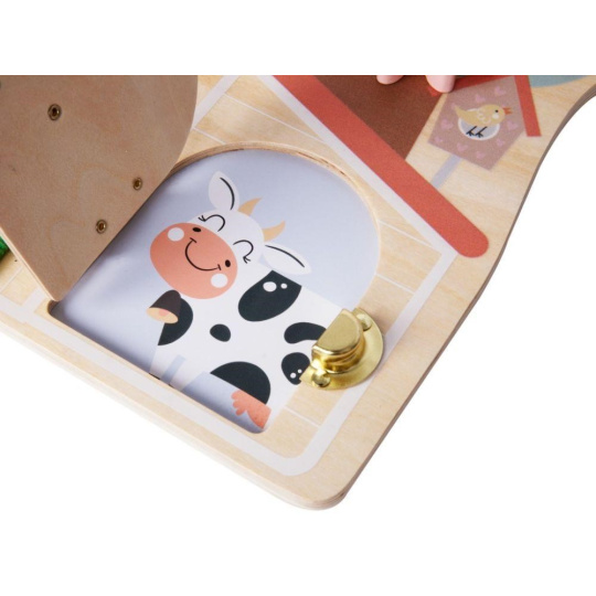 Aktivity board v podobe farmy zaviedne dievčatá aj chlapcov na vidiek, kde si pohrajú s hracími prvkami a osvojí si pár praktických zručností. Activity board s ozubenými kolami, korálkovým bludišťom, dvierkami a okienkom, rôznymi zámkami a rôznymi spôsobmi zapínania vedie deti k samostatnosti v hre, v poznávaní a učení sa, v obliekaní.