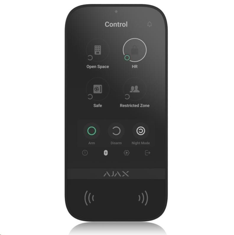 Klávesnica KeyPad TouchScreen zdedila rozhranie aplikácií Ajax pre chytré telefóny a poskytuje tak jednoduché a známe ovládanie systému. Päťpalcová dotyková obrazovka umožňuje rýchly prístup k aktuálnemu režimu zabezpečenia ktorejkoľvek skupiny. Aktivuje sa zdvihnutím ruky v blízkosti a má automatickú reguláciu jasu. Klávesnica má zvukovú indikáciu a môže upozorňovať na poplachy, oneskorenie pri vstupe/výstupe a otvorenie dverí pri odomknutí systému. Hlasitosť sa nastavuje v aplikáciách Ajax. Klávesnica taktiež zobrazuje výsledok kontroly integrity systému a informuje o poruchách pri zastrešení.