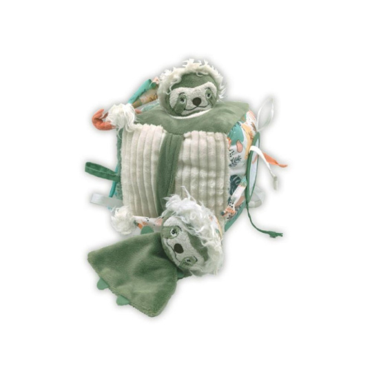 Hoci je lenochod zvieratko, ktoré sa pomaly pohybuje a väčšinu dňa prespí, tak táto activity kostka lenochod určite vaše dieťatko nenechá len tak oddychovať. Originálne prvky v podobe chrastítka, zrkadla, suchých zipsov, šuštiacich hodín, tvarov na suchý zips, s provázkami, s rôznymi materiálmi, s kapsičkou a so schovaným lenochodom motivujú dieťa k pohybu, k preskúmavaniu, objavovaniu, mačkaniu, ochutnávanie. Pri hre so zábavnými prvkami na activity kostke stimuluje deti svoje zmysly, zdokonaľujú jemnu motoriku aj koordináciu očí a rúk. Prezrite si túto úžasne hebkú kostku s aktivitami, ktorá je skvelým darčekom pre deti už od narodenia.