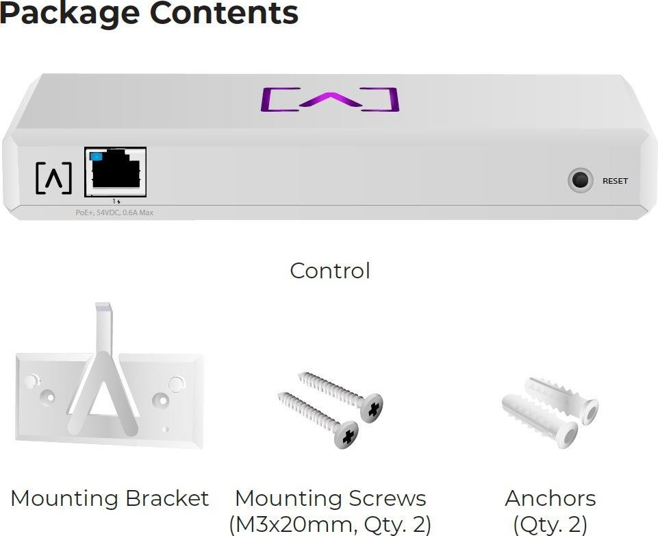 Lokální hardware Alta Labs Controller soužící pro monitoring a správu až 1000 jednotek Alta Labs - Wi-Fi Access Pointů, Switchů a Routerů ve vaší síti. Velice decentní a jednoduché zařízení s 4-jádrovým Qualcomm CPU s taktem 2200 MHz, jedním Gigabit LAN portem, podporou napájením přes PoE (802.3af, 42 - 57 V DC), USB-C konektorem (5 V / 3 A), Bluetooth pro prvotní nastavení přes mobilní aplikaci a předinstalovaným Alta Labs Controllerem dostupným přes webové rozhraní. Obsah balení • Zařízení • Držák na zeď • Šroubky + hmoždinky Konektory a rozhraní Rychlost LAN (1) 10/100/1000Mbps Ostatní Bluetooth Napájení Napájení přes PoE 802.3af, 42 .. 57V DC Typ napájení PoE, USB-C Max. spotřeba energie [W] 8 Napájení přes konektor/svorkovnici 5V / 3A Fyzické charakteristiky Provedení Na zeď, Desktop Ventilátory Bez ventilátoru Tlačítka Reset Provozní teplota [°C] -5 až 50 Hmotnost [g] 380 Hloubka [mm] 91 Šířka [mm] 180 Výška [mm] 26 Hardware CPU Qualcomm Frekvence CPU [MHz] 2200 Počet CPU jader 4 Software Předinstalovaný kontroller Alta Labs Controller Management Webové rozhraní Výchozí IP adresa Dynamická z DHCP Výchozí jméno a heslo Nastavuje se při prvním spuštění.