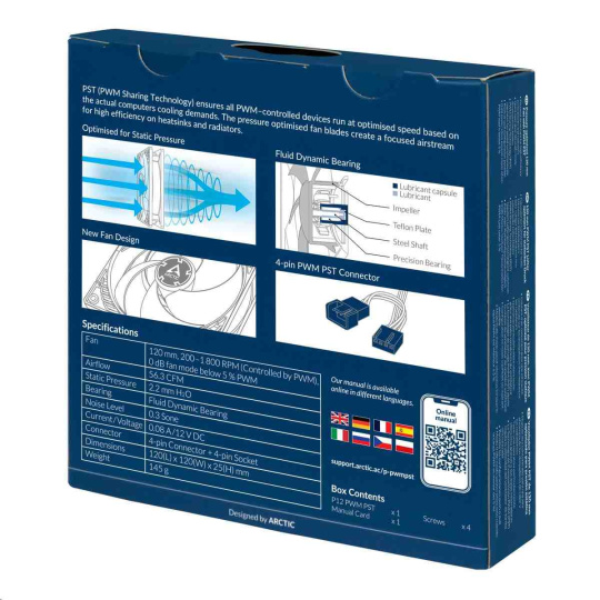 plynule a synchrónne s ostatnými ventilátormi vďaka technológii zdieľania PWM (PST) spoločnosti ARCTIC. Novo vyvinutý motor s nízkou teplotou cievky výrazne zvyšuje životnosť ventilátora. Preto sme predĺžili záruku na 10 rokov.