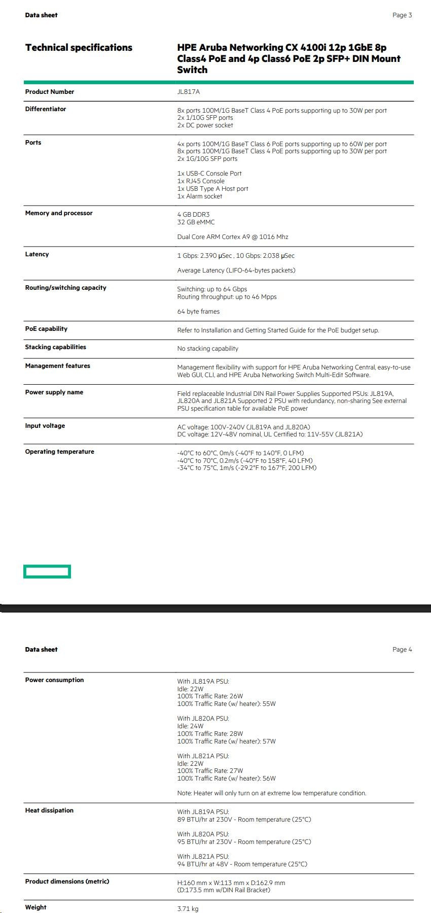 Aruba 4100i 12-port 1GbE (8-port Class 4 POE and 4-port Class 6 POE) 2-port SFP+ DIN Mount Switch JL817A RENEW