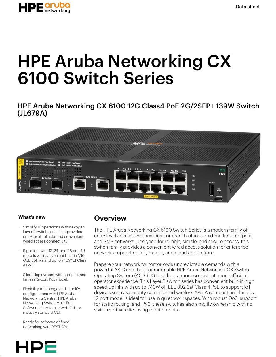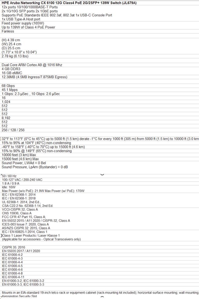 | Aruba 6100 12G Class4 PoE 2G/2SFP+ 139W Switch (JL679A) | |