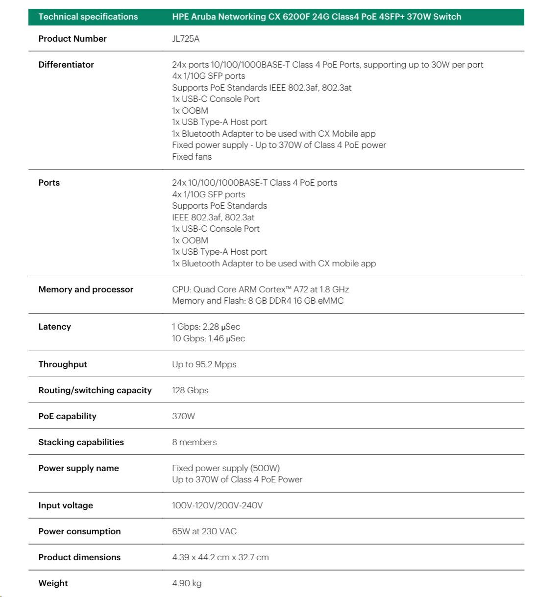 HPE Aruba Networking CX 6200F 24G Class4 PoE 4SFP+ 370W Switch JL725A RENEW