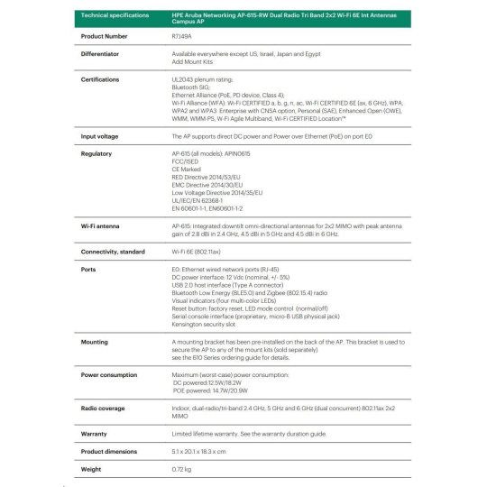 | Aruba AP-615 (US) Dual-radio Tri-band 2x2:2 802.11ax Wi-Fi 6E Internal Antennas Campus AP | R7J50A |