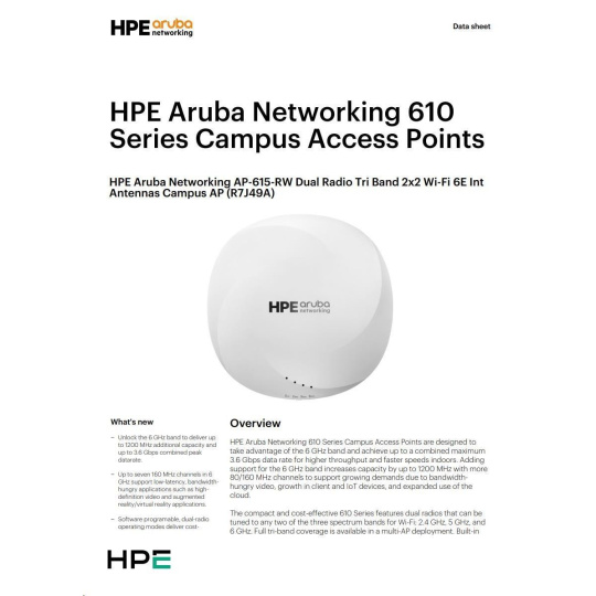 | Summary Aruba 610 Series Access Points are designed to take advantage of the 6 GHz band using two radios that can deliver comprehensive tri-band coverage in a multi-AP environment and better meet the growing demands of Wi-Fi due to increased use of video, growth in client and IoT devices, and expanded use of cloud. With a 3.6 Gbps combined peak data rate for higher throughput and faster speeds for indoor use, the Aruba 610 Series delivers a cost-effective enterprise Wi-Fi 6E solution with increased capacity, wider channels, reduced power consumption. |