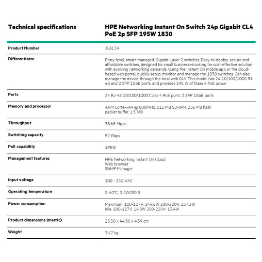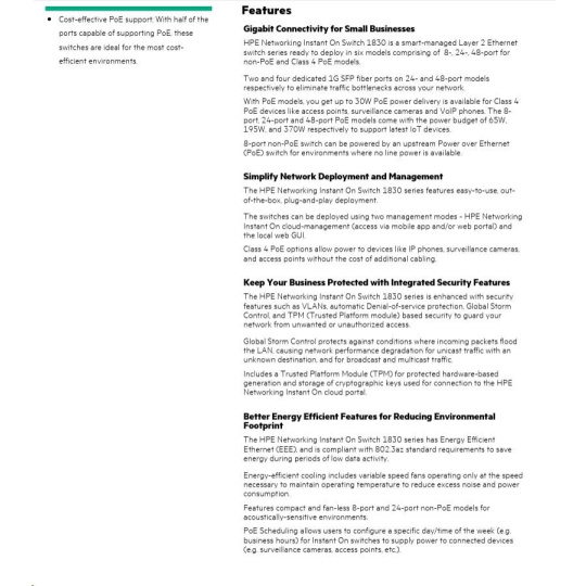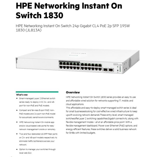 | Aruba Instant On 1830 8G Switch (JL810A) | Aruba Instant On 1830 8G 4p Class4 PoE 65W Switch (JL811A) | Aruba Instant On 1830 24G 2SFP Switch (JL812A) | Aruba Instant On 1830 24G 12p Class4 PoE 2SFP 195W Switch (JL813A) | Aruba Instant On 1830 48G 4SFP Switch (JL814A) | Aruba Instant On 1830 48G 24p Class4 PoE 4SFP 370W Switch (JL815A) | ||||
