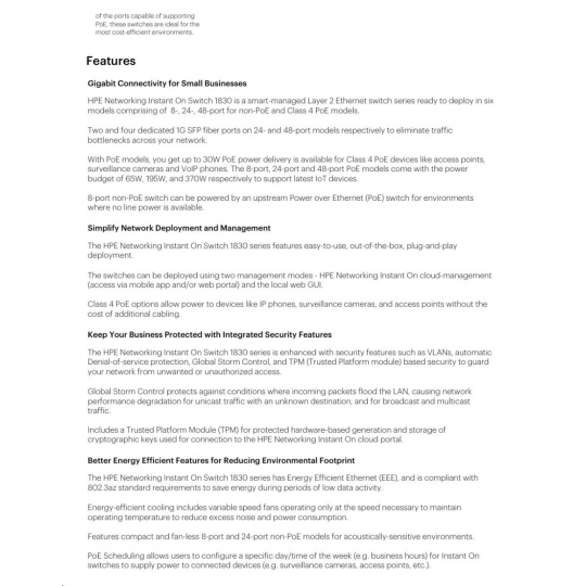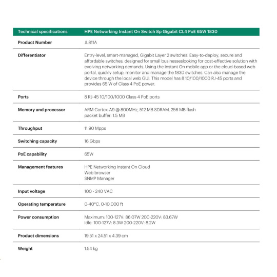 | Aruba Instant On 1830 8G Switch (JL810A) | Aruba Instant On 1830 8G 4p Class4 PoE 65W Switch (JL811A) | Aruba Instant On 1830 24G 2SFP Switch (JL812A) | Aruba Instant On 1830 24G 12p Class4 PoE 2SFP 195W Switch (JL813A) | Aruba Instant On 1830 48G 4SFP Switch (JL814A) | Aruba Instant On 1830 48G 24p Class4 PoE 4SFP 370W Switch (JL815A) | ||||||||