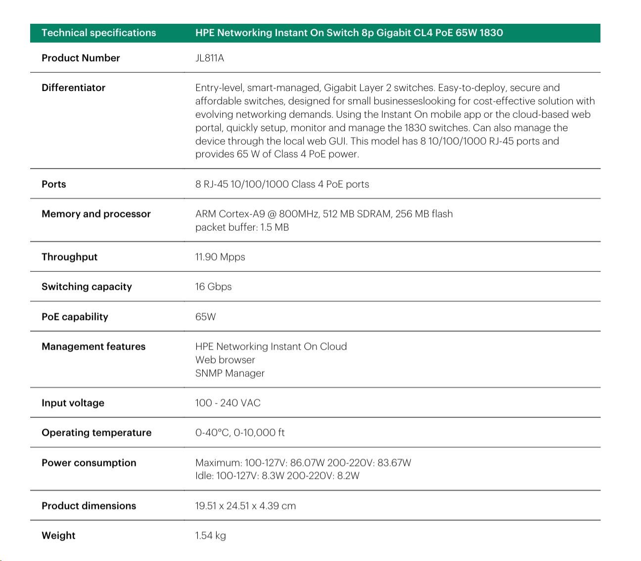 | Aruba Instant On 1830 8G Switch (JL810A) | Aruba Instant On 1830 8G 4p Class4 PoE 65W Switch (JL811A) | Aruba Instant On 1830 24G 2SFP Switch (JL812A) | Aruba Instant On 1830 24G 12p Class4 PoE 2SFP 195W Switch (JL813A) | Aruba Instant On 1830 48G 4SFP Switch (JL814A) | Aruba Instant On 1830 48G 24p Class4 PoE 4SFP 370W Switch (JL815A) | ||||||||