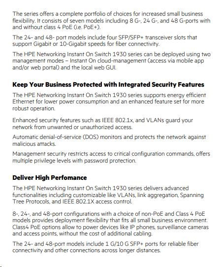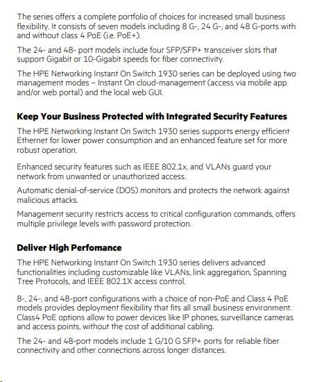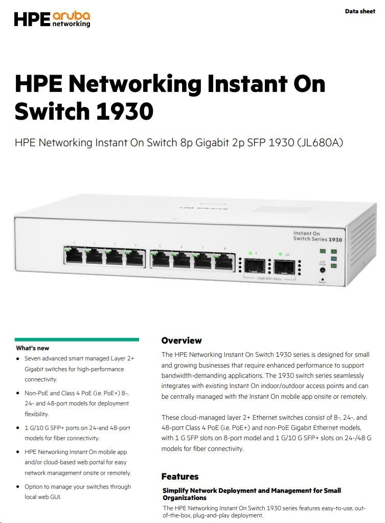 Řada přepínačů Aruba Instant On 1930 se vyznačuje snadným používáním a nasazením typu "plug-and-play" po vybalení z krabice.Řadu přepínačů Aruba Instant On 1930 lze nasadit pomocí dvou způsobů. Režimů správy - Instant On cloud-management (přístup přes síť). Druhou variantou je využití mobilní aplikace a/nebo webového portálu a místního webového grafického rozhraní.Řada přepínačů Aruba Instant On 1930 se vyznačuje snadným používáním a nasazením typu "plug-and-play" po vybalení z krabice.Řadu přepínačů Aruba Instant On 1930 lze nasadit pomocí dvou způsobů. Režimů správy - Instant On cloud-management (přístup přes síť). Druhou variantou je využití mobilní aplikace a/nebo webového portálu a místního webového grafického rozhraní.
