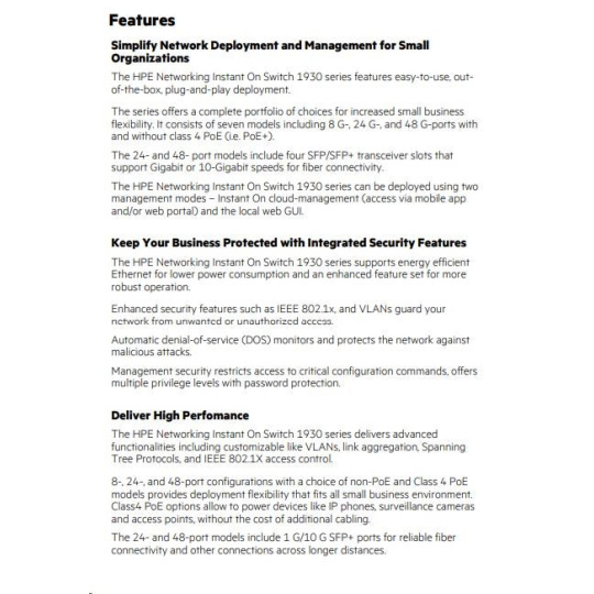 Whether you own a cafe, a design firm or a tech startup, a reliable and secure network plays a critical role in the success of your business. And you need a network solution that gives you peace of mind, allowing you to focus on growing your business instead of managing problems with your network. Aruba Instant On makes it easy to keep network users happy, mobile and IoT devices connected, and your network secure. The Aruba Instant On 1930 switches features advanced, smart-managed, fixed- configuration Gigabit switches designed for small businesses that are easy-to-deploy and affordable. They're made to handle today's bandwidth-heavy applications like voice and video conferencing, enabling consistent connectivity to enhance performance. Using either the Instant On mobile app or the cloud-based web portal, you can quickly set up, monitor and manage the 1930 switch series from anywhere at any time. What's more, up to 30 W PoE power delivery is available out-of-the-box for your class 4 PoE devices, like access points, surveillance cameras and VoIP phones, all easily managed from the same platform. Built-in security features protect your network from unauthorized access by allowing you to segment traffic and define access to each area of the network. And all of this is included in the price of the hardware - there are no hidden subscription or licensing fees.