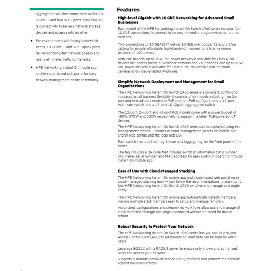 | In today's digital-first environment, small businesses face many challenges to stay afloat and competitive. With tight budgets and limited technical expertise, they're struggling to keep up with the explosion of devices and bandwidth-heavy applications running on the network. To optimize both performance and investment, small businesses need cost-effective, next-gen networking solutions. The Aruba Instant On 1960 Switch Series is an easy-to-use and affordable wired solution for networks supporting IT, mobile and cloud applications. Aruba Instant On 1960 Switches are advanced, smart-managed, fixed configuration Gigabit stackable switches designed for small and growing businesses that are easy to deploy and affordable. These switches are designed to scale as business grows, making adding more employees, devices and applications simple. Aruba Instant On 1960 switches are made to handle today's bandwidth-heavy applications like voice and video conferencing, enabling consistent connectivity to improve user experience and application performance.