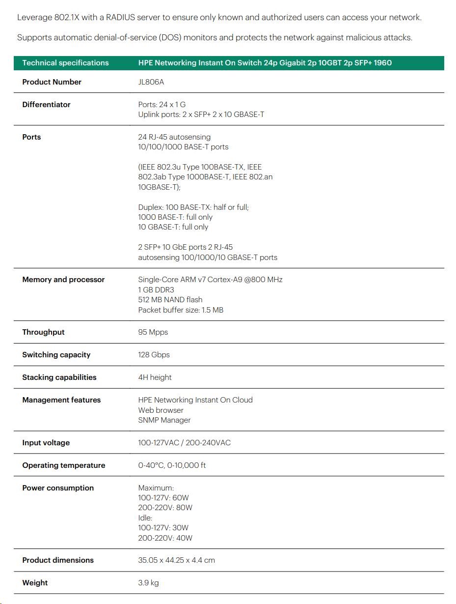 | The Instant On Differentiators The Aruba Instant On mobile app allows you to set up, manage, and monitor Instant On switches and access points directly from your phone. Within the app, you get guided step-by-step instructions to install Instant On devices to get your network up and running quickly - no technical expertise required. And cloud-based access allows you to access the network from anywhere, at any time. Cloud-Managed Stacking The Aruba Instant On mobile app and cloud-based web portal make cloud-managed stacking easy - just follow the recommendations to stack up to four (4) 1960 switches and manage as a single entity. The Instant On mobile app automatically detects members, making multiple stack members easy to setup and manage remotely. Automated configurations and streamlined workflows allow users to manage all stack members through one single dashboard without the need for device reboot. Luggage Tag Each switch has a pull-out tag, known as a luggage tag, on the front panel of the switch. The tag includes a QR code that includes switch ID information (SKU number, SKU name, serial number, and MAC address) for easy switch onboarding through Instant On mobile app. Non-Intrusive, Aesthetic Design Aruba Instant On switches are designed to complement the sleek and clean look of the Instant On access points, and to blend discreetly into your site's environment. The 8-port models, as well as the 24- and 48-port non PoE+ models, are fan-less, making them ideal for quiet office deployments. High Performance With Flexible Options The series consists of two (2) PoE switches, and two (2) non-PoE switches including 24- and 48-port Gigabit Ethernet switches with two (2) dedicated 10G SFP+ ports and two (2) 10GBASE-T uplink ports on 24-/48- port models. The series also includes a 12-port 10Gbps aggregation switch with four (4) 10G SFP+ ports to meet the bandwidth requirements of small businesses. Optimized User Experience The Aruba Instant On mobile app provides common workflows for Instant On switches and access points making it easier to configure, monitor and manage your network remotely without the need for additional hardware like cloud keys. You can also update firmware on your Instant On devices directly from the cloud whenever you want, from wherever you are. Site Inventory And Topology View The site inventory view shows all Instant On switches and access points on a single interface, and the topology view provides an intuitive structure of all Instant On devices deployed on the network - allowing you to quickly identify non-functioning devices and troubleshoot accordingly. Network issues can be easily diagnosed with connectivity tests like Ping and Traceroute. Multi-Site Remote Management The cloud-hosted web interface and mobile app make it easy to remotely manage multiple sites, multiple networks, distributed deployments and multi-tenant deployments. Each site is logically separated and has its own configuration, statistics, guest portal, and admin read/write privileges. Instant On allows you to create three admin accounts per site, offering the option to lock accounts from accidental deletion or to allow your account to be managed by a trusted partner. Built-In Security Built-in security features protect your network from external threats by blocking malware attacks and keeping unauthorized users off the network. Network traffic can be filtered and access restricted based on MAC and IP address. No Hidden Fees All features are included in the price of the hardware - there are no recurring subscription or licensing fees. Expert-level support and industry leading limited lifetime warranty are also included, along with chat support for the life of the product. |