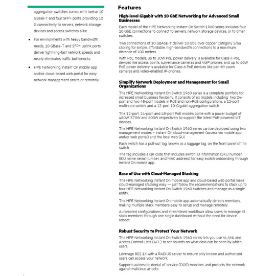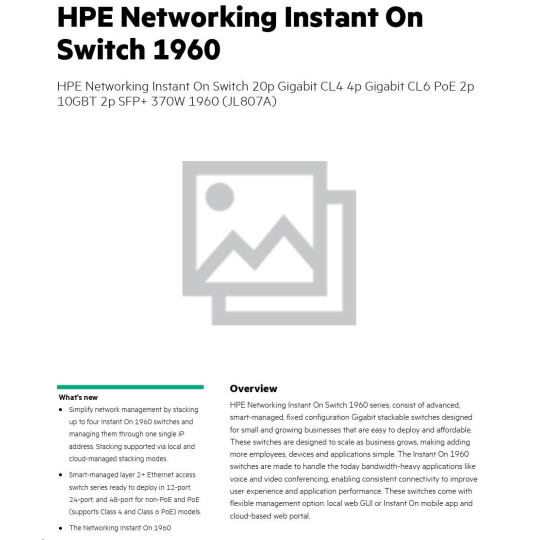 HPE Networking Instant On Switch 20p Gigabit CL4 4p Gigabit CL6 PoE 2p 10GBT 2p SFP+ 370W 1960 (JL807A)