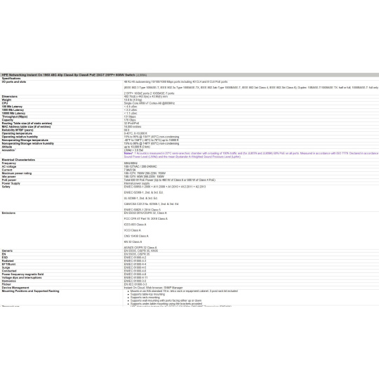 Notes1: 1 Acoustics measured in 23°C semi-anechoic chamber with a loading of 100% traffic and (for JL807A and JL809A) 50% PoE on all ports. Measured in accordance with ISO 7779. Declared in accordance with ECMA-109:2010. Values presented are the Declared A-Weighted Sound Power Level (LWAd) and the mean Bystander A-Weighted Sound Pressure Level (LpAm)
