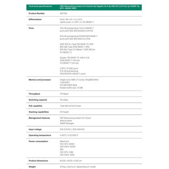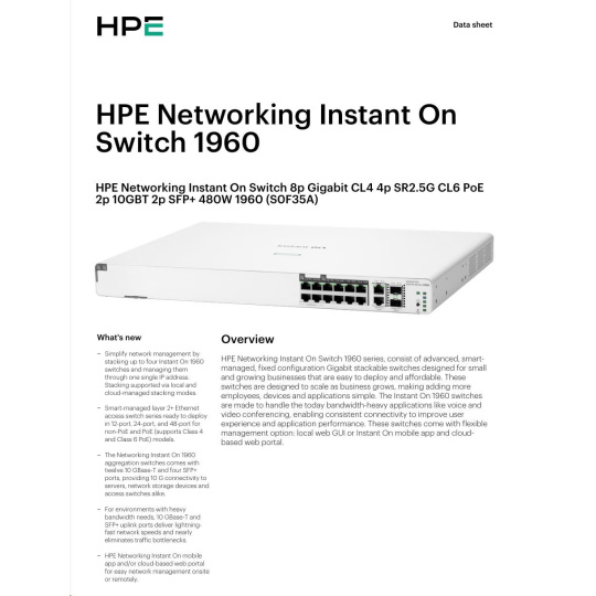 HPE Networking Instant On Switch 8p Gigabit CL4 4p SR2.5G CL6 PoE 2p 10GBT 2p SFP+ 480W 1960