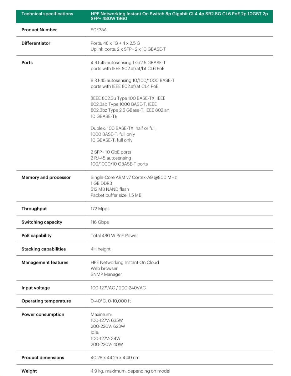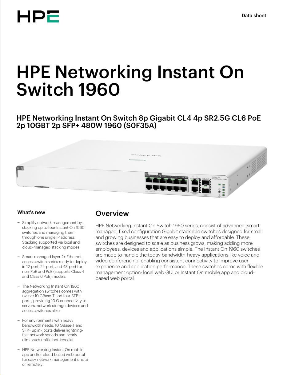 HPE Networking Instant On Switch 8p Gigabit CL4 4p SR2.5G CL6 PoE 2p 10GBT 2p SFP+ 480W 1960