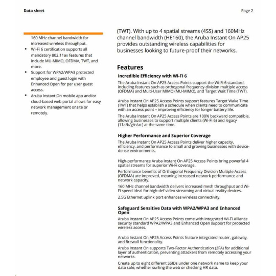 | Ultra-high-speed performance for high-density small businesses. Perfect for gaming, boutique hotels, tech start-ups and professional offices. The rise of the remote and hybrid workplace has placed increased pressure on business networks. Existing Wi-Fi infrastructure is struggling to support the explosion of devices and bandwidthhungry applications - all contributing to spotty video calls and sluggish download speeds. The Aruba Instant On AP25, a 4x4 Wi-Fi 6 access point, is designed to meet the increasing volume of connected devices. Delivering superior performance, coverage, and speed at a competitive price, the AP25 is the perfect access point for small and growing businesses. The Wi-Fi Certified 6TM AP25 delivers faster Wi-Fi speeds, greater capacity, and reduced latency between access points and devices for a superior Wi-Fi experience. AP25 improves efficiency and reduces congestion for networks with many connected devices, making it ideal for high-density environments. And with 4x the capacity of 802.11ac access points, the AP25 provides exceptional user experience, allowing businesses to serve more customers with higher speed and less congestion. Features of the AP25 include orthogonal frequency-division multiple access (OFDMA), multi-user MIMO and target wake time (TWT). With up to 4 spatial streams (4SS) and 160MHz channel bandwidth (HE160), the AP25 provides groundbreaking wireless capabilities for businesses looking to boost performance and future-proof their networks. |