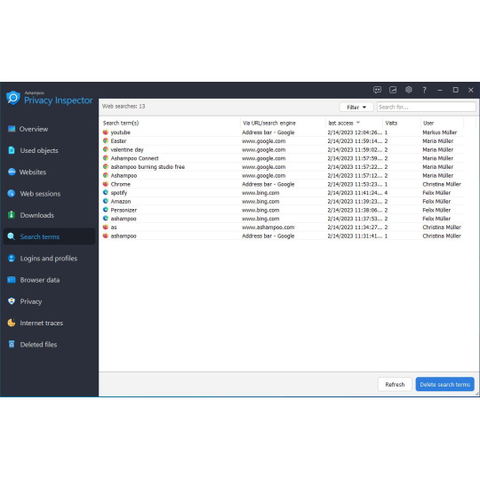 Majte plnú kontrolu nad históriou sťahovania a vyhľadávania. Online zdroj, veľkosť súboru, čas sťahovania - s Ashampoo Privacy Inspector máte všetky potrebné informácie na dosah ruky - nielen vy, ale aj všetci ostatní, ktorí používajú váš počítač! Ale nebojte sa, vstavané filtre vám pomôžu okamžite identifikovať a odstrániť citlivé informácie. Chcete sa vrátiť na nedávnu stránku, ale zabudli ste, ako sa tam dostať? Ashampoo Privacy Inspector vám s tým tiež pomôže!