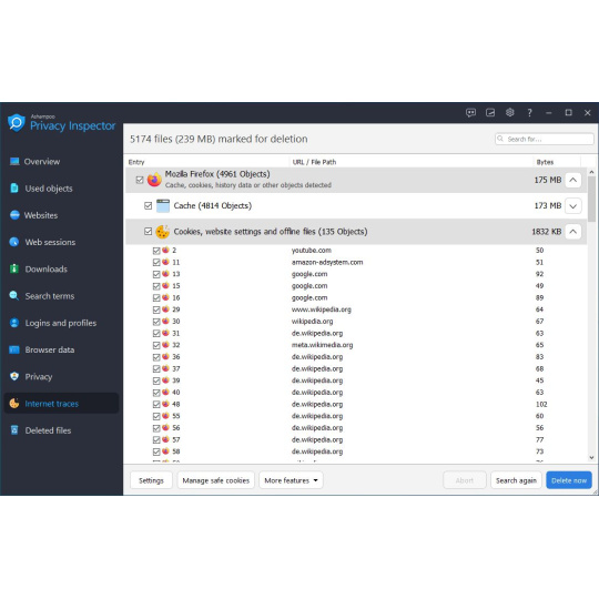 Niekedy sa stane, že musíte zopakovať svoje posledné aktivity na internete. Ako ste sa dostali na stránku a čo ste hľadali? Ashampoo Privacy Inspector vám pomôže analyzovať webové relácie pomocou rozsiahleho zoznamu alebo stromového zobrazenia, ktoré zahŕňa všetky vaše online aktivity. Prežite znova svoju históriu prehliadania webu a už nikdy nestratíte žiadne vlákno.