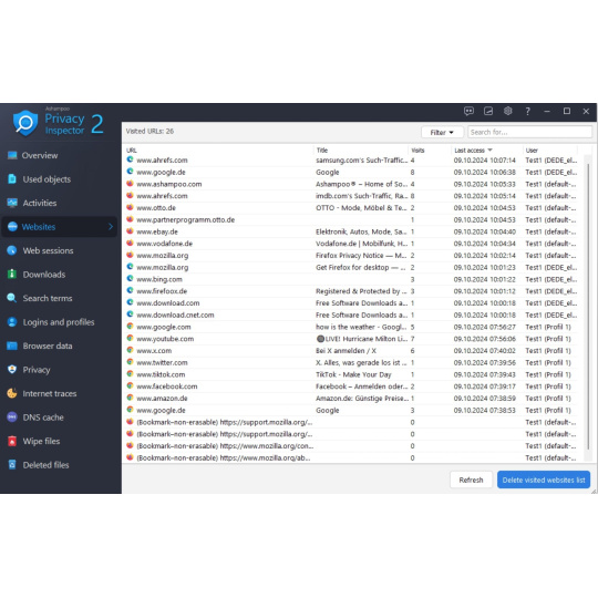 Majte plnú kontrolu nad históriou sťahovania a vyhľadávania. Online zdroj, veľkosť súboru, čas sťahovania - s Ashampoo Privacy Inspector máte všetky potrebné informácie na dosah ruky - nielen vy, ale aj všetci ostatní, ktorí používajú váš počítač! Ale nebojte sa, vstavané filtre vám pomôžu okamžite identifikovať a odstrániť citlivé informácie. Chcete sa vrátiť na nedávnu stránku, ale zabudli ste, ako sa tam dostať? Ashampoo Privacy Inspector vám s tým tiež pomôže!