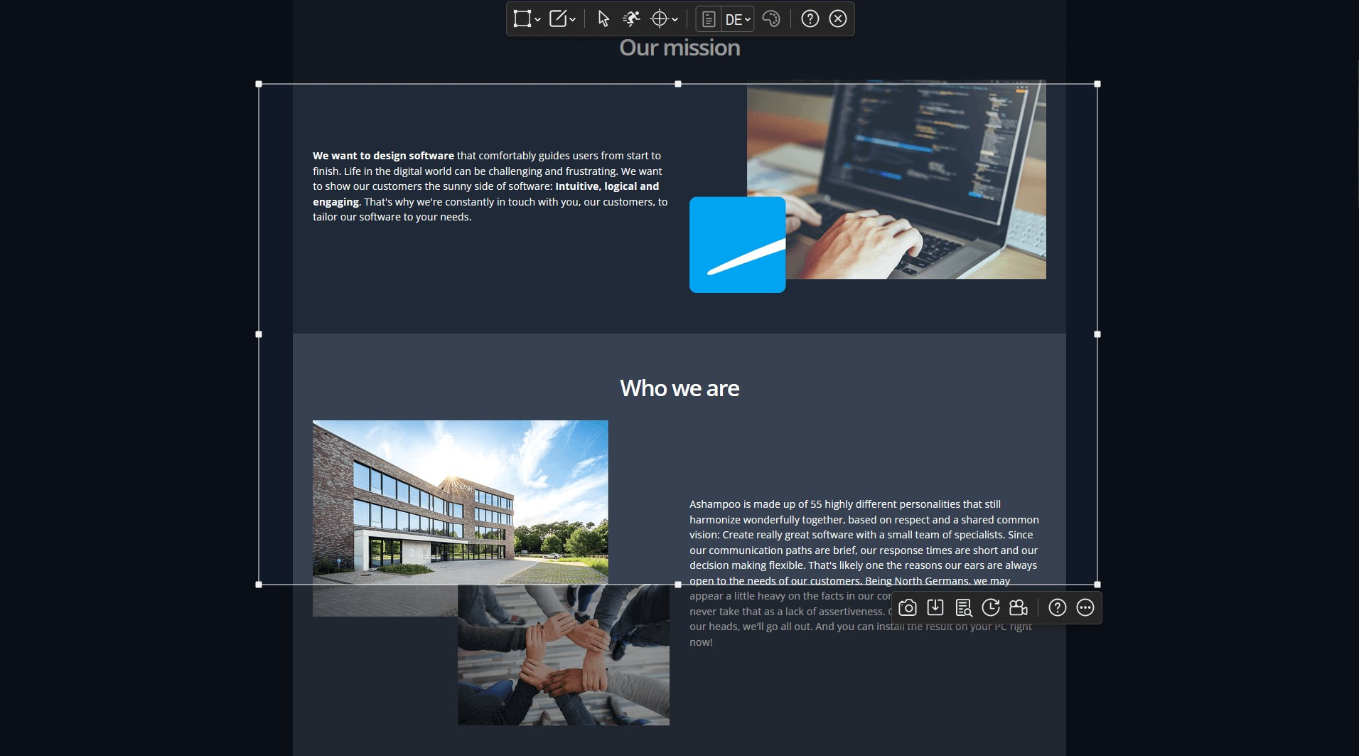 Po aktivácii Snap automaticky rozpozná prvky pod ukazovateľom myši (okná prehliadača, ponuky programov, obrázky atď.) a ponúka okamžité snímanie jedným kliknutím. Tým to však nekončí: Snap dokáže zachytiť aj vlastné obdĺžnikové alebo voľné oblasti a dokonca podporuje posúvanie obsahu! Program samozrejme podporuje všetky druhy zdieľania vrátane e-mailu a Ashampoo Web!
