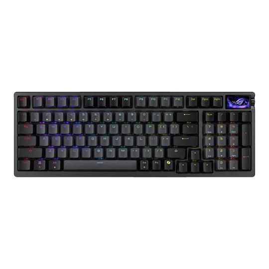 ROG Azoth 96 HE analogová herní klávesnice s vyměnitelnými magnetickými spínači ROG HFX V2 a senzorem ROG Hall. Nabízí OLED displej, třísměrný ovládací knoflík, trojí způsob připojení s bezdrátovou technologií ROG SpeedNova 8K, režim Zone, šestivrstvé tlumení a odnímatelné silikonové opěrky zápěstí.