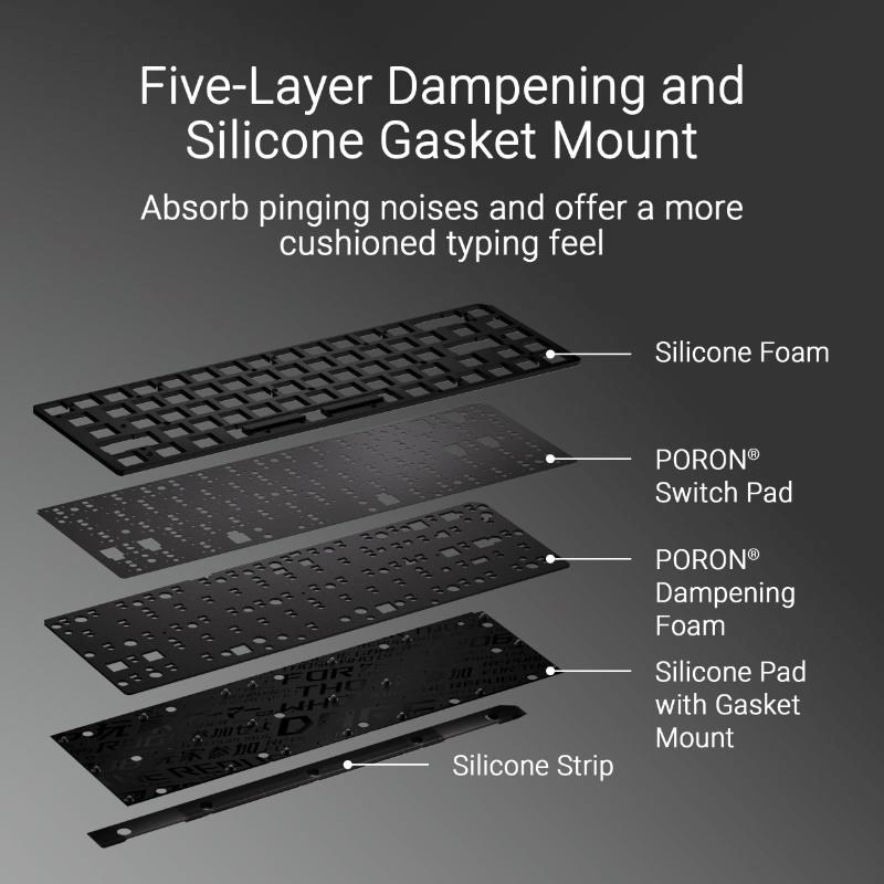 - Vylepšené možnosti písania: Integrované päťvrstvové tlmenie a silikónové tesnenie pohlcujú zvuky cinkania a ponúkajú tlmenejší pocit pri písaní