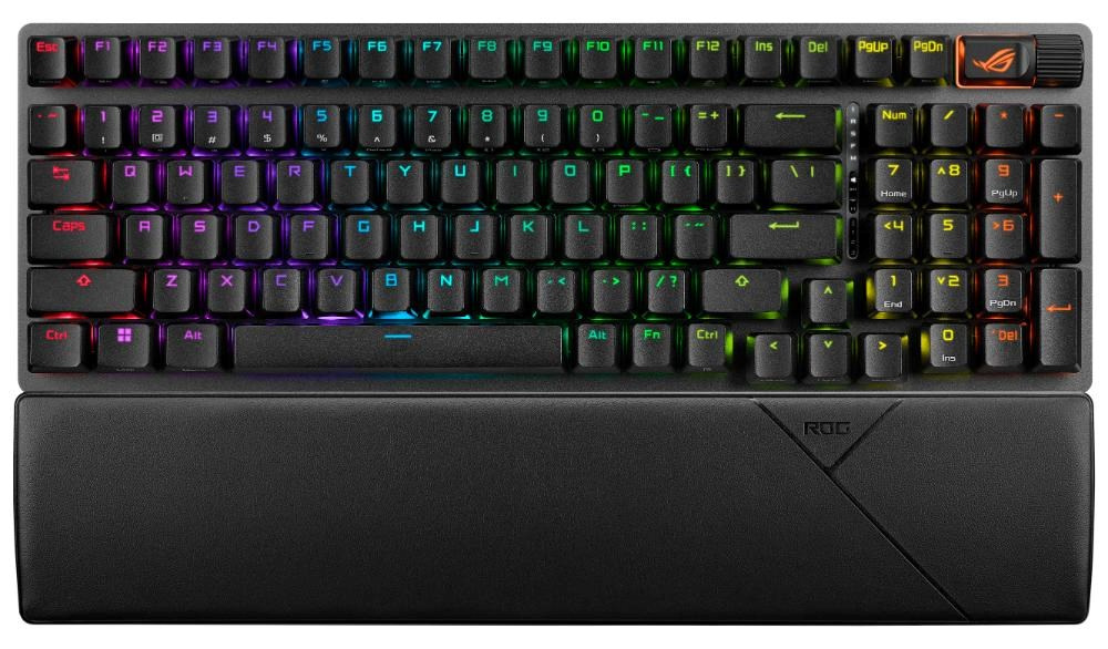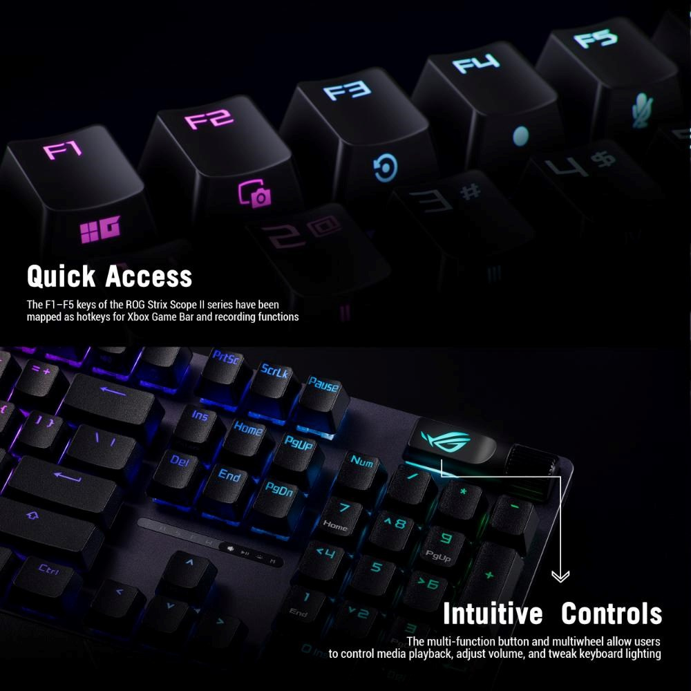 Herná klávesnica ROG Strix Scope II X s mechanickými spínačmi ROG NX V2 s možnosťou výmeny za prevádzky, penovým tlmením zvuku, zdvojenými klávesami PBT alebo ABS s UV povlakom, streamovacími klávesami, multifunkčnými ovládacími prvkami, tromi uhlami sklonu a opierkou zápästia.