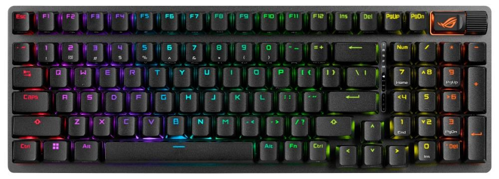 - Unikátna medzerník s motívom ROG: UV potiahnutý medzerník so špeciálnym označením ROG a tromi RGB LED žiarovkami na spodnej strane