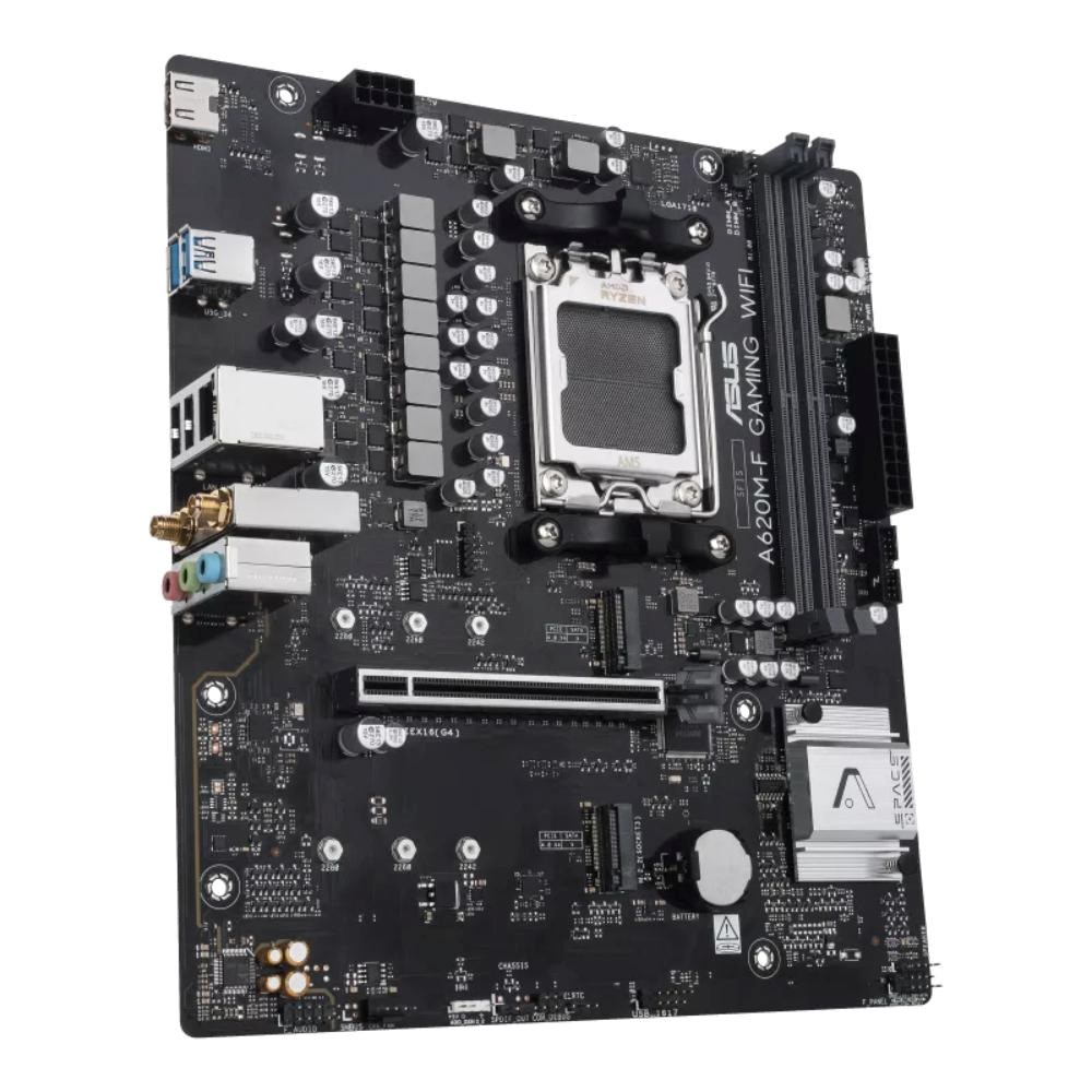 - AMD A620 (Ryzen AM5) mATX motherboard with DDR5, PCIe 4.0 support, dual M.2 slots, HDMI™, Realtek 2.5Gb Ethernet, Wi-Fi 6, rear USB 5Gb/s ports, Aura Sync
