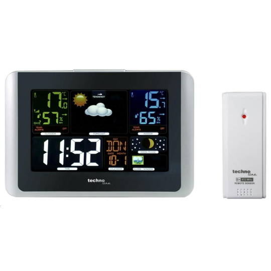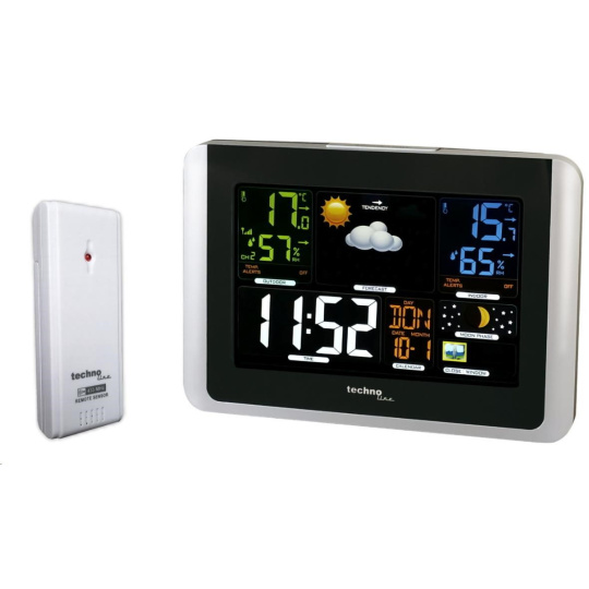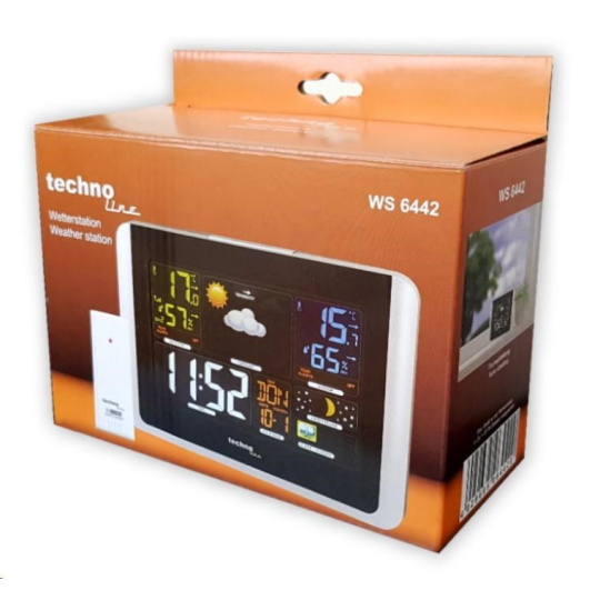 Meteorologická stanica s inverzným farebným LED displejom - farebný inverzný LED displej 127 x 79 mm, stále osvetlený pri napájaní sieťovým adaptérom, 2 stupne jasu, možnosť vypnutia, pri napájaní batériami možnosť osvetlenia displeja na 10 s - farby displeja: čas biela, dátum oranžová, vnútorná teplota a relatívna vlhkosť modrá, vonkajšia teplota a relatívna vlhkosť zelená - veľkosť číslic: čas 25,5 mm, skrátený názov dňa, dátum 10 mm, teplota 15,5 mm, rel. vlhkosť 11,5 mm - čas riadený rádiovým signálom DCF-77 - možnosť manuálneho nastavenia času - 12- alebo 24-hodinový formát zobrazenia času - možnosť nastavenia časovej zóny od -12 do +12 hodín - dátum, skratka názvu dňa (EN, FR, GE, SP, IT, NL, DK) - budík s funkciou opakovaného budenia (Snooze) po 10 minútach - budenie zvukovým signálom (10 sekúnd 1 pípnutie za sekundu, 10 sekúnd 2 pípnutia za sekundu, potom stále 4 pípnutia za sekundu) - 6 animovaných ikon predpovede počasia (jasno, polojasno, zamračené, dážď, búrky, snehové prehánky) - zobrazenie hodnôt vnútorné a vonkajšej teploty a relatívnej vlhkosti - možnosť zobrazenia teploty vo F alebo ve C - pamäť na max. a min. namerané hodnoty teploty a relatívnej vlhkosti (automaticky sa maže o 0:00) - šípky tendencie vývoja barometrického tlaku, vnútorné teploty a relatívnej vlhkosti - alarm horná a dolná hranica vonkajšej teploty na každom kanáli v rozsahu od -40 °C do +60 °C zvukovým signálom - alarm horná a dolná hranica vnútorné teploty v rozsahu od 0 °C do +50 °C zvukovým signálom - ikona nutnosti zatvorenia alebo otvorenia okna na základe nameraných vnútorných teplôt a relatívnej vlhkosti - možnosť zobrazenia vonkajšieho rosného bodu a teplotného indexu - fáza Mesiaca - možnosť pripojenia až 3 bezdrôtových senzorov mode- mode- TX960-TH, jeden bezdrôtový senzor je súčasťou balenia - možnosť automatického prepínania kanálov po 30 s - bezdrôtový prenos hodnôt vonkajšej teploty na frekvencii 433 MHz - dosah až 100 m v otvorenom priestore - indikácia slabých batérií - farba hlavnej jednotky čierna so strieborným rámikom - rozmery hlavnej časti 174 x 119 x 29 mm - napájanie sieťovým adaptérom alebo batériami - možnosť postavenia alebo zavesenia Bezdrôtové čidlo TX960-TH - vodeodolné prevedenie - dosah signálu bezdrôtového čidla až 100 m v otvorenom priestore - meranie teploty a relatívnej vlhkosti - indikácia vysielania LED diódou - možnosť postavenia a zavesenia - farba biela - rozmery 39 x 99 x 24 mm - napájanie 3 ks batérií 1,5 V typ AAA (mikrotužkové) Obsah balenia - hlavná jednotka WS 6442 - bezdrôtové čidlo TX960-TH - sieťový adaptér 5 V, 150 mA - návod CZ, EN, PL, GE, FR, ES, IT, NL