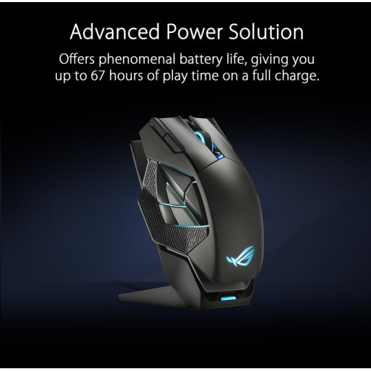 - Pokročilé riešenie napájania - ROG Spatha X ponúka fenomenálnu výdrž batérie, vďaka ktorej môžete na plné nabitie hrať až 67 hodín. A ak sa batéria vybije, stačí 15 minút nabíjania cez USB-C alebo nabíjací dok, aby ste mohli hrať až 12 hodín* intenzívneho bezdrôtového hrania.