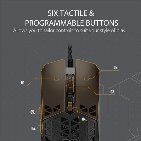 Ľahká drôtová herná myš so snímačom s rozlíšením 16 000 dpi, šiestimi programovateľnými tlačidlami, ultraľahkým plášťom Air Shell, odolnosťou voči vode IPX6, antibakteriálnou ochranou ASUS, šnúrkou TUF Gaming Paracord a čistými PTFE nožičkami