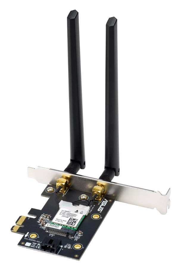 WiFi 6E PCI-E Adapter with 2 external antennas. Supporting 6GHz band, 160MHz, Bluetooth 5.2, WPA3 network security, OFDMA and MU-MIMO ASUS WiFi 6E total solution - optimized capabilities and performance All-new 6 GHz band - Less congestion and interference for WiFi connections Latest Bluetooth® 5.2 - improved signal range, faster transmit speeds and less interference Ultrafast WiFi 6 & WiFi 6E – 4.6X faster speeds, improved connection efficiency and better network security Reduced dead zones with external antennas - Adjustable antennas allows easy positioning for the best reception. Wi-Fi 6E (802.11ax) AXE5400 Tri-Band PCIe Wi-Fi Adapter MU-MIMO 160Mhz-Gigabit WiFi (2402Mbps) Bluetooth 5.2 Tri Band 2.4G & 5G & 6G.