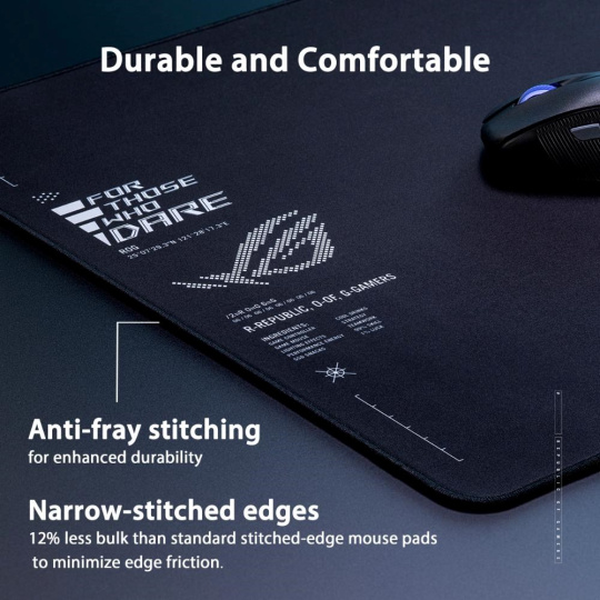 ROG Sheath II XXL je veľká herná podložka pod myš s pokročilou chladicou tkaninou a plochými šiťými okrajmi proti odieraniu a protišmykovou gumovou základňou