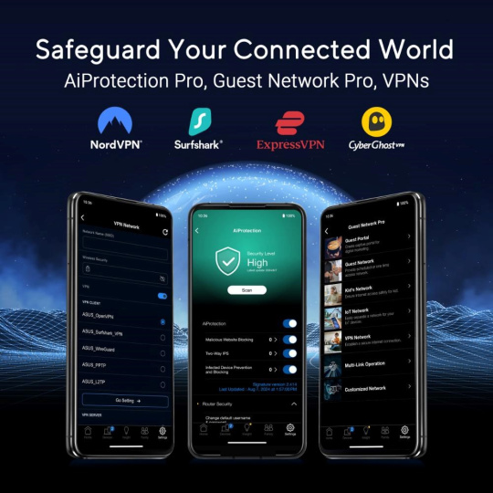 | Zabezpečenie | AiProtection VPN WPA3 Personal, WPA2 Personal, WPA Personal, WPA Enterprise, WPA2 Enterprise, WPA3 Enterprise, Open System & OWE WPS Let's Encrypt DNS-over-TLS SSH Bezpečnostné skenovanie Firewall - Maximálny filter kľúčových slov brány firewall : 64 - Maximálny filter sieťových služieb brány firewall : 32 - Maximálny filter URL brány firewall : 64 |