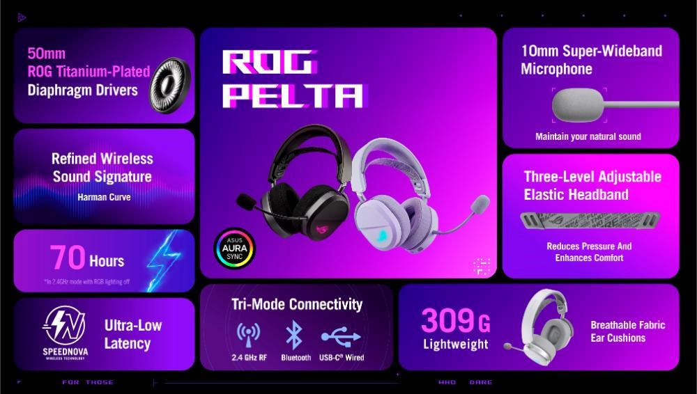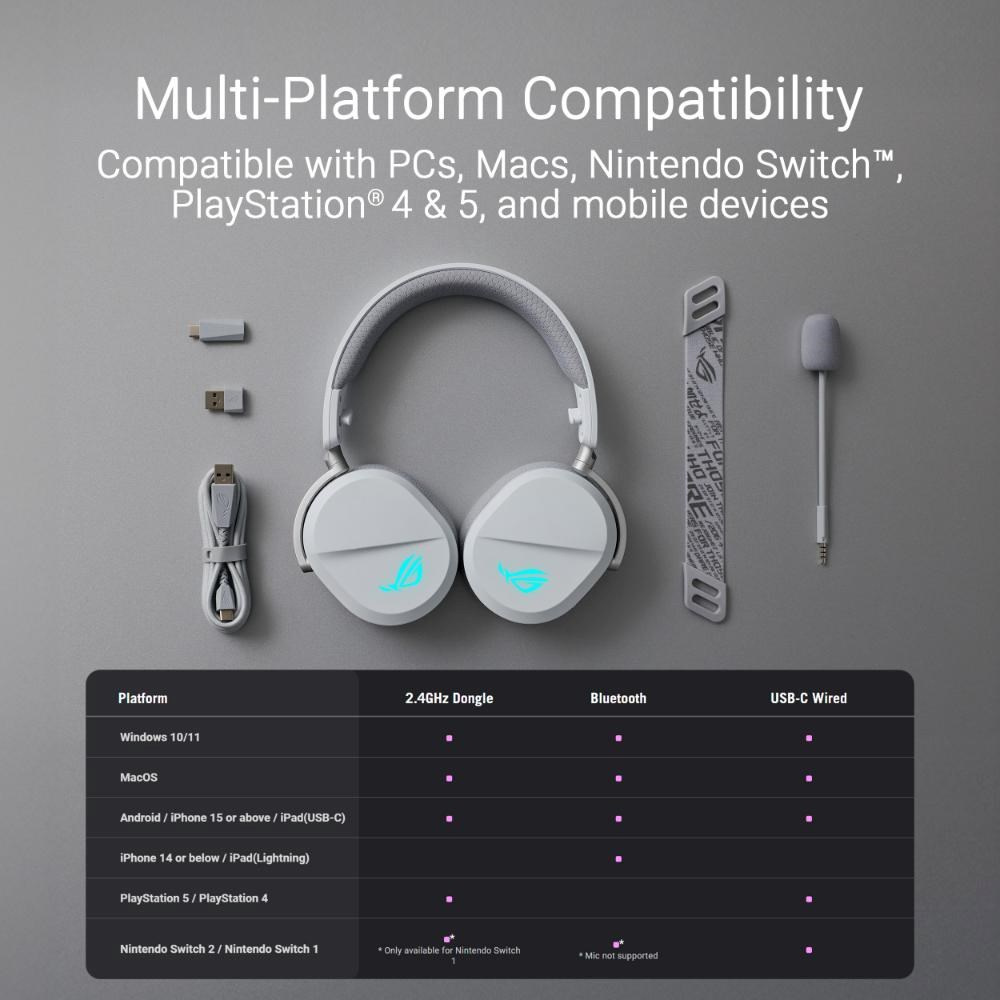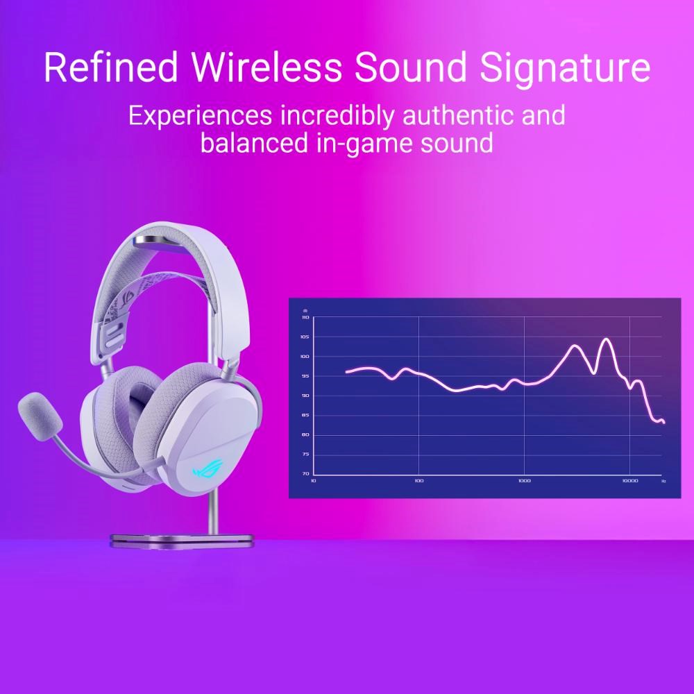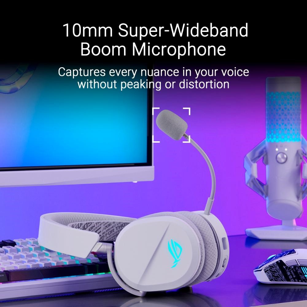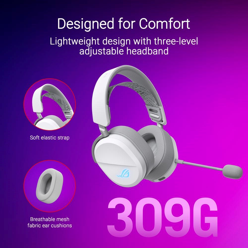 Herné slúchadlá so štyrmi režimami RGB s bezdrôtovou technológiou ROG SpeedNova, 50mm ROG titanom pokovené membránové meniče, vylepšený bezdrôtový zvukový podpis, 10mm super širokopásmový raménkový mikrofón, ľahký dizajn 309 g a navyše osvetlenie ASUS Aura Sync RGB