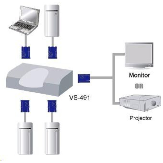 Elektronický video prepínač 4 PC - 1 VGA VS-491 - voľba zdroja signálu pomocou tlačidla - rozlíšenie až 1920x1440 - VGA, SVGA, Multisync - zosilňuje signál VGA - mód úspory energie pri vypnutom PC - vzdialenosť kábla až 10 m bez straty kvality signálu - aktívny prvok vrátane napájacieho adaptéra - kompatibilný s DDC, DDC2, DDC2B. Konektory: - 15pinový HDB vstup 4x samica - 15pinový HDB výstup 1x samica - hmotnosť 220g - rozmery 120x65x64mm..