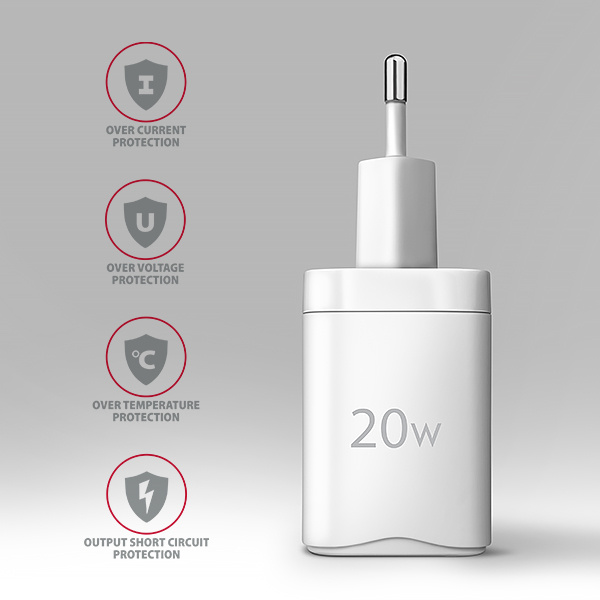 Pokročilý systém ochrany na výstupe nabíjacieho adaptéra chráni nabité zariadenie pred poškodením. Funkcia nabíjačky tiež zaisťuje, že nabíjané zariadenie je rozpoznané a je zvolená optimálna rýchlosť a priebeh nabíjania.