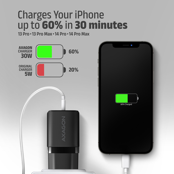 Kompaktná sieťová nabíjačka AXAGON ACU-PQ30 Sil USB pre rýchle nabíjanie až dvoch mobilných zariadení súčasne. Nabíjačka s celkovým výkonom 30 W nabíja telefóny, tablety a ďalšie mobilné zariadenia najvyššou možnou rýchlosťou. Adaptér ponúka nielen štandardný USB-A konektor, ale aj obojstranný USB-C konektor.