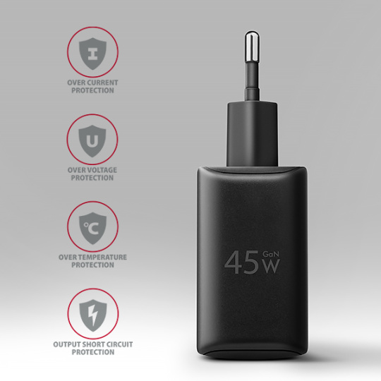 Kompaktné rozmery a vysoký výkon sú spôsobené použitím novej technológie GaN. Použité komponenty z nitridu gália pracujú s vysokou účinnosťou, čo umožňuje vysoký výkon v malých rozmeroch. Nabíjačka je vybavená výstupmi Power Delivery 3.0 / Quick Charge 4+ USB typu C a Quick Charge 3.0 USB typu A, ktoré umožňujú rýchle nabíjanie nielen smartfónov a tabletov, ale aj malých notebookov s výkonom až 45W.
