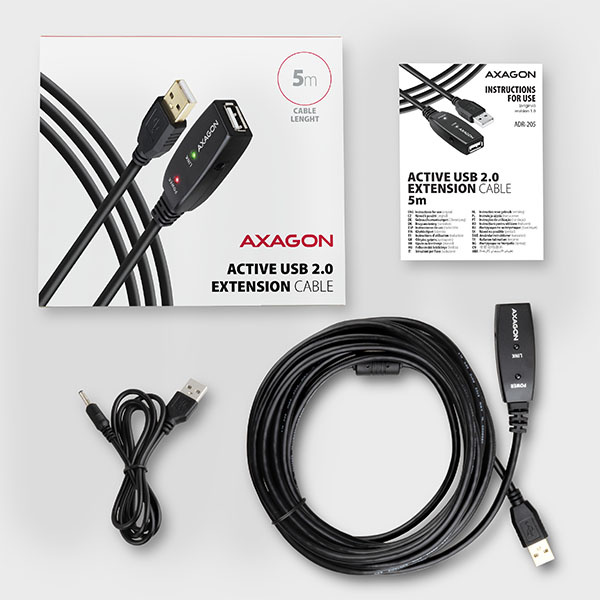 Aktívne rozšírenie USB 2.0 Kábel AXAGON ADR-205 dlhý 5 metrov. Opakovací kábel USB zosilňuje priechodný signál USB a umožňuje pripojiť zariadenia USB na podstatne väčšiu vzdialenosť, ako je obvyklých 5 metrov pri použití pasívnych káblov. Možnosť pripojenia viacerých opakovacích káblov za sebou.
